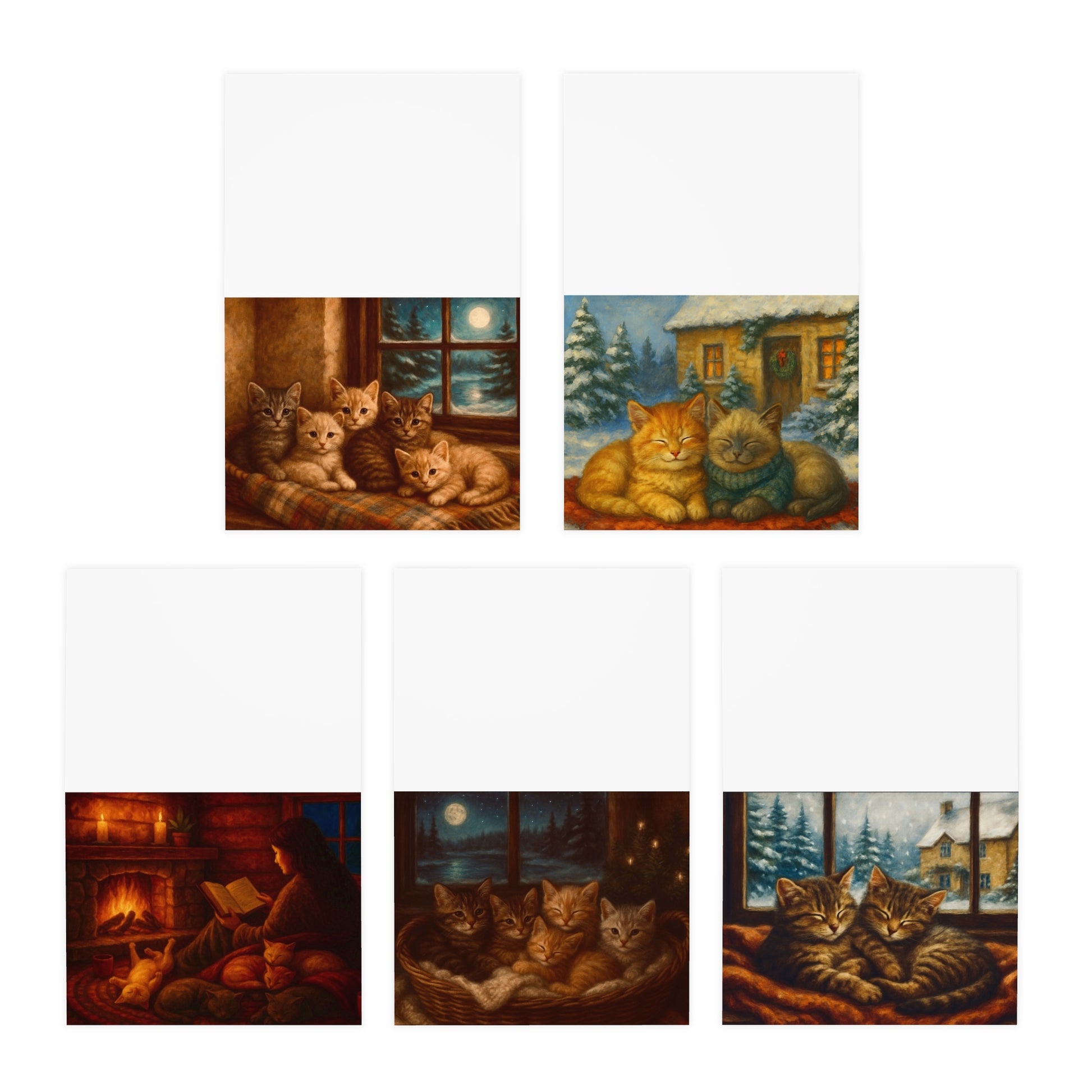 Bring warmth and charm to any occasion with these delightful greeting cards. This 5-pack features enchanting designs that capture the cozy essence of home and heart. Ideal for sending heartfelt messages during holidays, birthdays, or just because, these cards convey love and happiness. Perfect for cat lovers and anyone who appreciates charming, illustrative art, they make every note a cherished memory. Whether it’s for Christmas, Valentine’s Day, or a simple thank you, these cards are versatile and inviting, adding a personal touch to your gestures. Each card, vibrant and full of character, will surely bring a smile to any recipient's face.