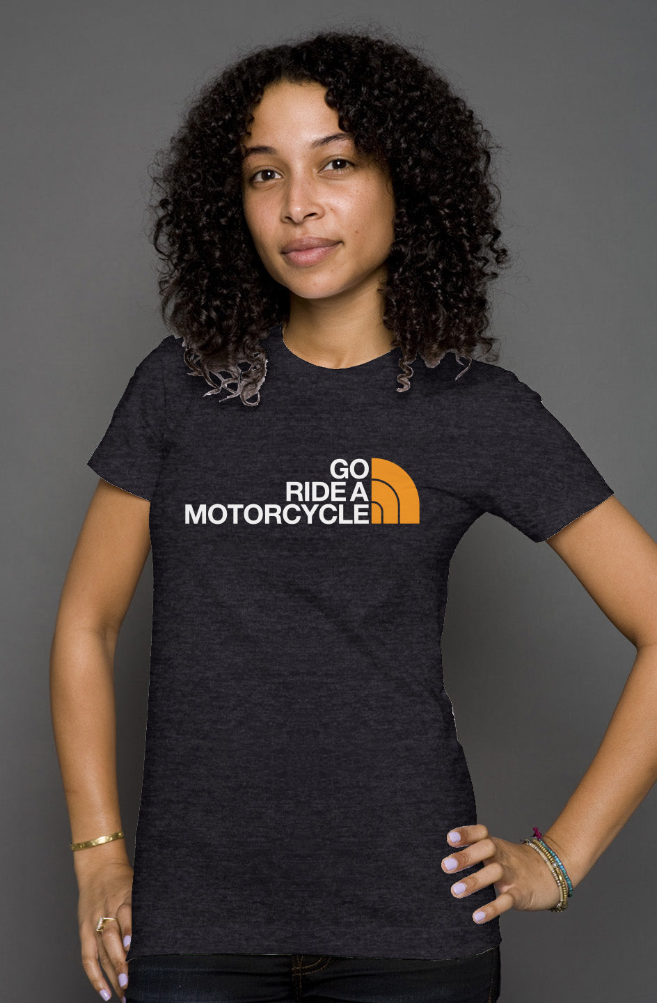 'Go ride a motorcycle' NF Parody Women's Heather T-shirt. Our parody take of 'Go ride a motorcycle' design across the chest of this women's slim fit, heather t-shirt. Soft, comfortable and the perfect fit. Enjoy the ride!